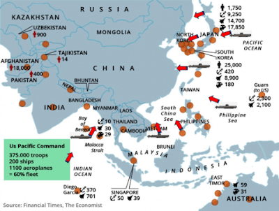Men spreekt in de media en politiek over de agressie van China, waarbij men doelt op de kleine eilandjes die China tot haar grondgebied rekent en de eilandjes die het zelf creëert, nooit zullen die media, politici en ‘deskundigen’ van rechtse denktanks het volk vertellen dat de VS maar liefst 400 militaire bases heeft rond een groot deel van China, vanwaar het doelen in China kan aanvallen/raken, dit met (kern-) raketten, straaljagers, bommenwerpers, marineschepen en onderzeeërs….. Bedenk maar eens wat de VS zou doen als China 400 bases had vanwaar het de VS op redelijk korte afstand zou kunnen aanvallen >> de Derde Wereldoorlog (WOIII) zou al achter de rug zijn!! Maar nee >> China is de grote agressor!! ha! ha! ha! ha! ha! ha! ha!