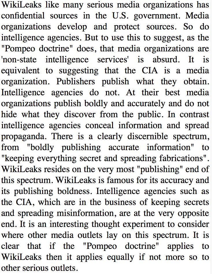 Assange, continuing, stated that such an extrapolation “is equivalent to suggesting that the CIA is a media organization. Publishers publish what they obtain. Intelligence agencies do not. At their best, media organizations publish boldly and accurately and do not hide what they discover from the public. In contrast, intelligence agencies conceal information and spread propaganda.”